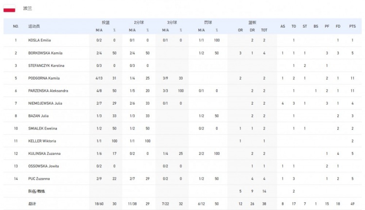 波兰队数据:艾米莉亚1分2篮板,B-卡米拉5分4篮板,P-卡米拉11分2篮板,亚历山德拉11分2篮板,N-茱莉亚4分2篮板4助攻,B-茱莉亚3分2篮板,艾琳娜2分2篮板,凯勒2分,K-苏珊娜5分2篮板,P-苏珊娜5分4篮板