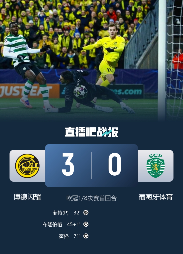 3月12日讯 北京时间4:00,欧冠1/8决赛首回合博德闪耀vs葡萄牙体育,比赛在阿斯米拉体育场打响!上半场,哈康·埃文森错失单刀良机;瓦扬尼迪斯送点,菲特点射破门!海于格直塞变线,布隆伯格小角度推射远角再下一城!下半场,霍格包抄破门,海于格献助攻,本场造2球!最终,博德闪耀主场3-0完胜葡萄牙体育,欧冠豪取5连胜!次回合将在葡体主场进行。