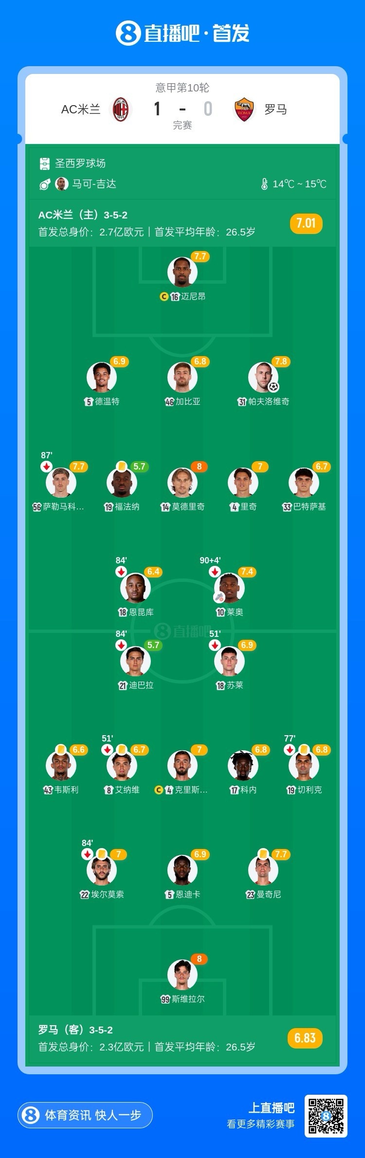全场比赛结束,米兰1-0罗马。