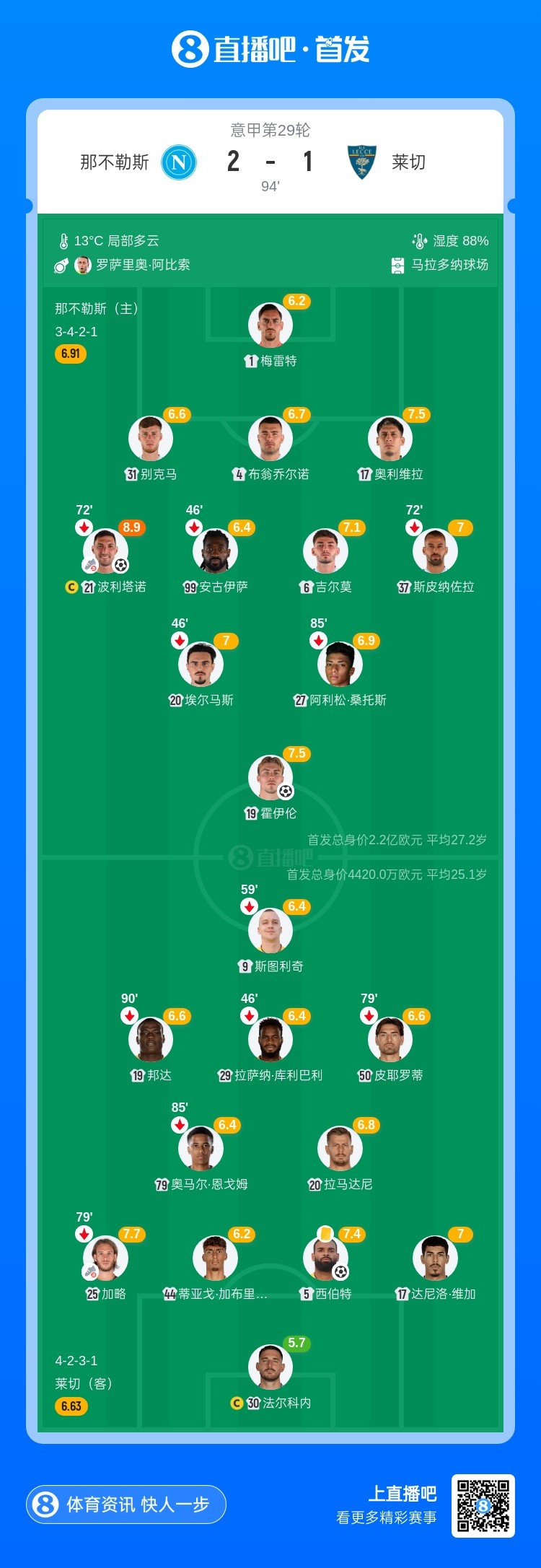 3轮连胜!那不勒斯2-1逆转莱切距榜首9分 霍伊伦破门波利塔诺传射