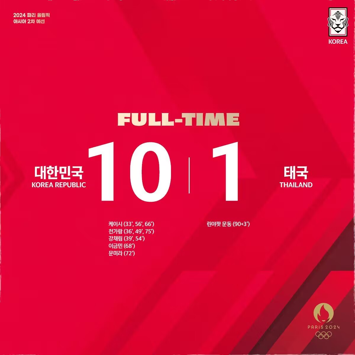 女足奥预赛B组-韩国10-1大胜泰国,16岁凯西菲尔戴帽