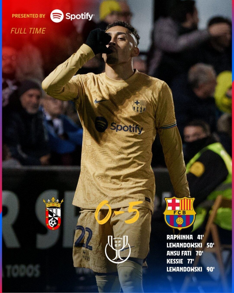 1月20日讯北京时间1月20日凌晨3:00,国王杯1/8决赛,巴萨对阵休达。上半场,拉菲尼亚远射破门为巴萨取得领先;下半场,莱万梅开二度,法蒂、凯西破门扩大领先优势!全场比赛结束,巴萨5-0大胜休达晋级下一轮。