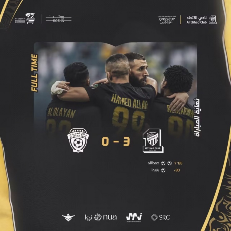吉达联合首发:1-马约夫、15-卡德什、5-奥马尔-豪萨维、33-奥拉扬、12-扎卡里亚-豪萨维(62'28-巴沙特)、6-法尔汉、7-坎特、16-哈姆迪(75'77-阿姆里)、90-罗马里尼奥、99-哈姆达拉、9-本泽马