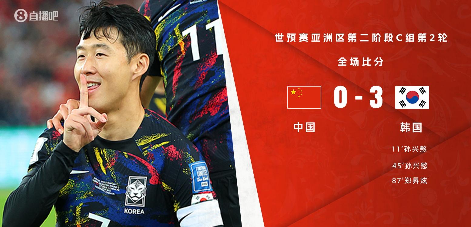 世预赛-国足0-3完败韩国 孙兴慜2射1传裁判判罚多次引争议