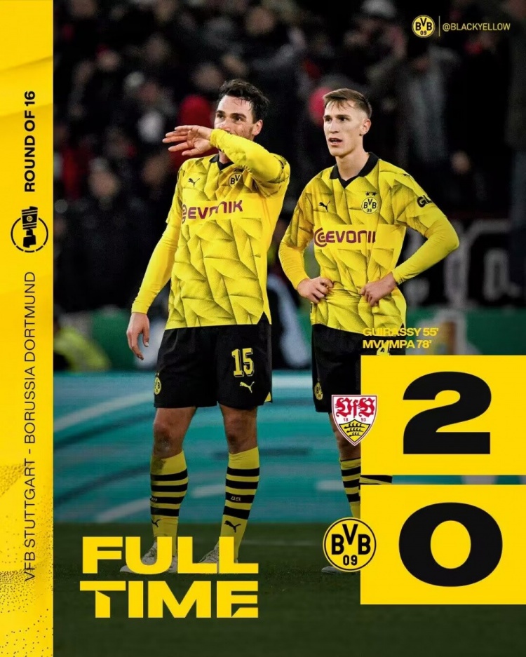德国杯-多特0-2斯图加特止步16强 吉拉西破门赛季13场18球