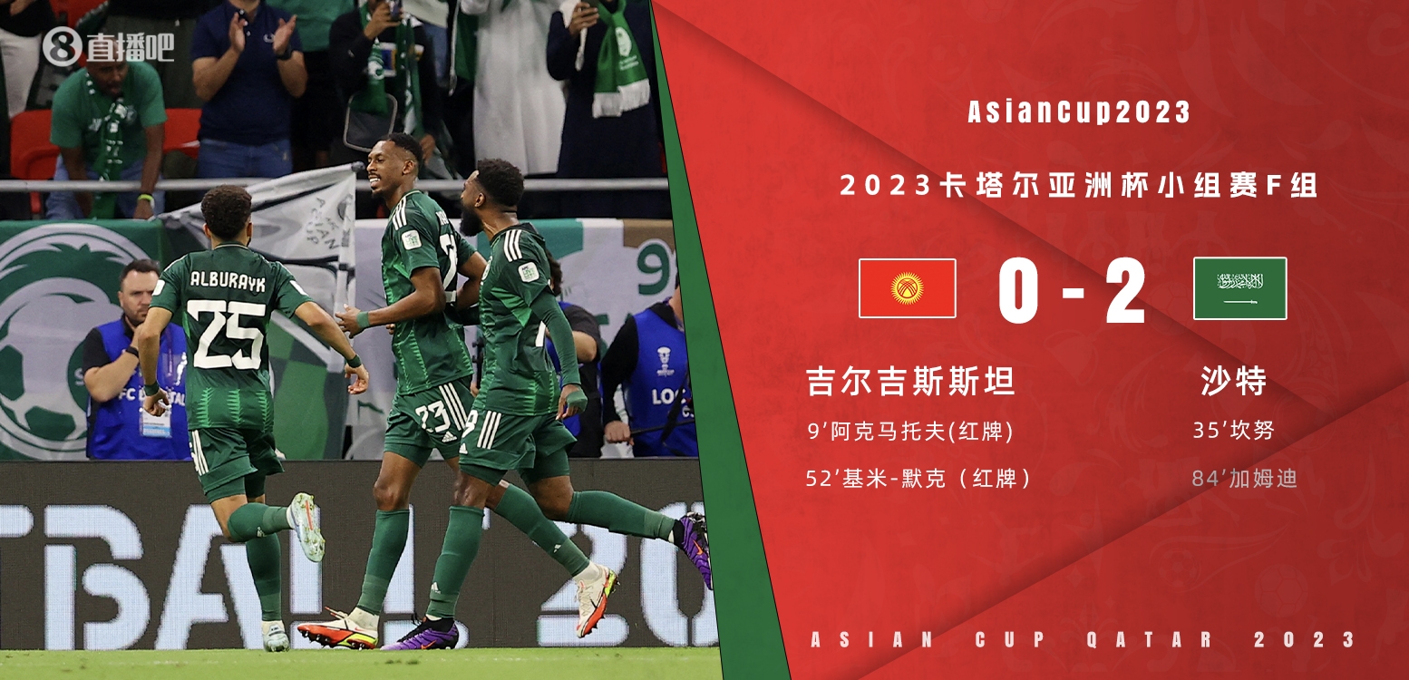 1月22日讯 北京时间1月22日凌晨1时30分,亚洲杯F组第2轮,吉尔吉斯斯坦对阵沙特。上半场,阿克马托夫染红,坎努首开纪录。沙特半场1-0领先吉尔吉斯斯坦。下半场,基米-默克被红牌罚下,加姆迪破门。最终9人应战的吉尔吉斯斯坦0-2不敌沙特。本轮战罢,沙特两战全胜排名小组榜首,提前一轮锁定出线名额,吉尔吉斯斯坦两战皆负排名垫底。