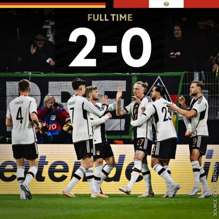 3月26日讯 北京时间3月26日03:45,国际友谊赛德国主场迎战秘鲁的比赛,上半场菲尔克鲁格梅开二度,下半场格纳布里侧钩中楣,哈弗茨点球中柱,最终德国2-0秘鲁。