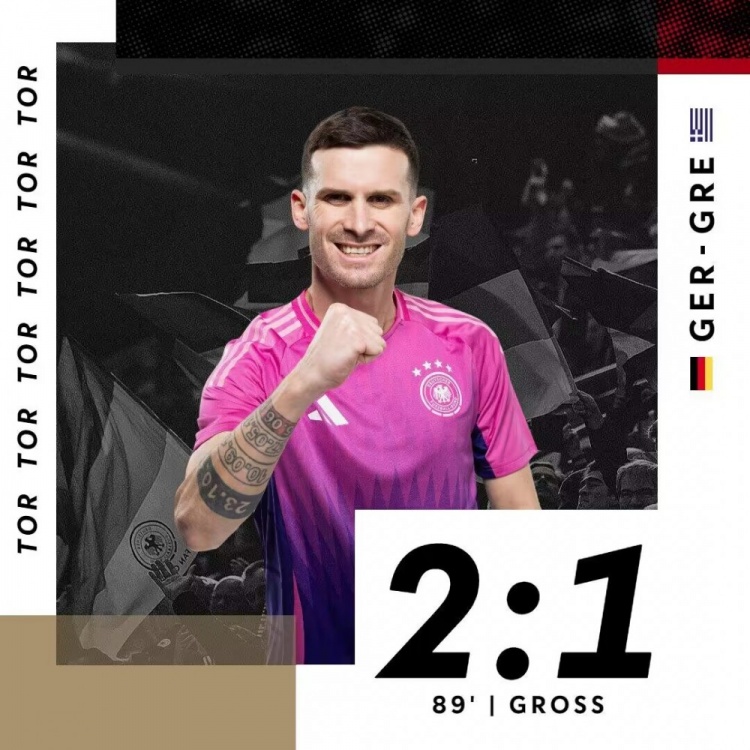第89分钟,德国队右路的传中球到禁区,被解围出来,弧顶格罗斯张弓搭箭直接凌空远射得分!德国2-1逆转绝杀希腊↓