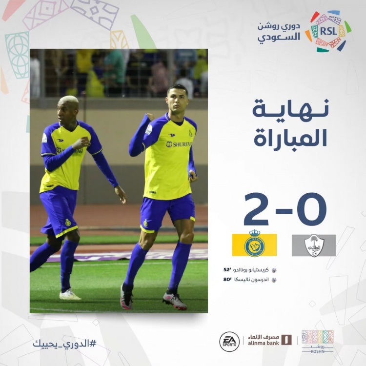 5月17日讯 北京时间5月17日02:30,沙特联赛第27轮利雅得胜利挑战塔利的比赛,上半场利雅得胜利占据优势但未打破僵局,下半场苏莱希姆造点C罗点射建功,塔利斯卡抢断破门,最终利雅得胜利客场2-0塔伊。积分榜方面,塔伊10胜4平12负积34分排名第7,利雅得胜利18胜6平3负积60分排名第2。