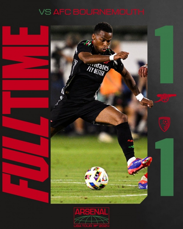 友谊赛-阿森纳1-1伯恩茅斯 维埃拉抽射破门双方将进行点球大战