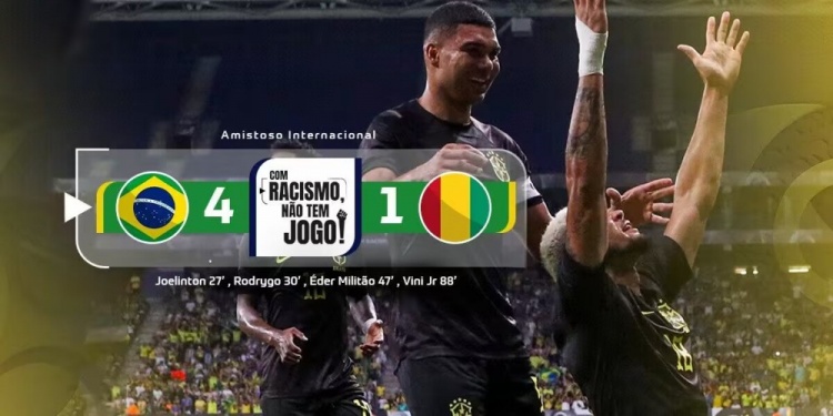 6月18日讯 北京时间6月18日凌晨3时30分,国际足球友谊赛,巴西对阵几内亚。上半场,乔林顿首开纪录,罗德里戈扩大领先优势,吉拉西扳回一城。巴西半场2-1领先几内亚。下半场,米利唐打进一球,维尼修斯点射破门。最终巴西4-1击败几内亚。