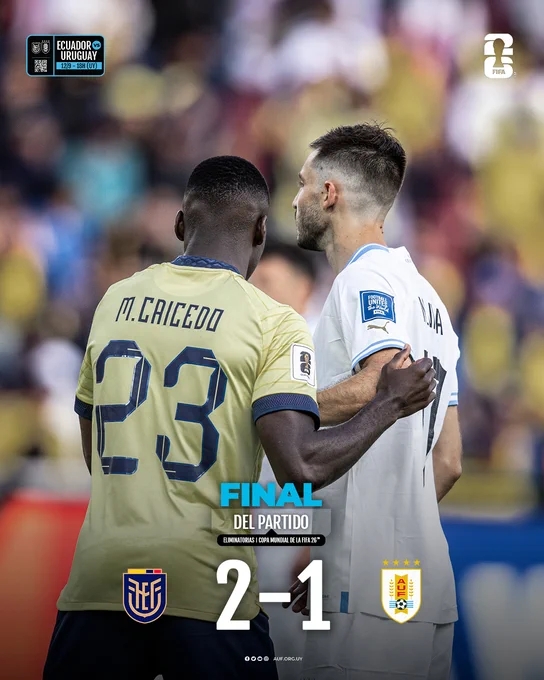 世预赛-凯塞多、派斯送助攻,厄瓜多尔2-1逆转乌拉圭