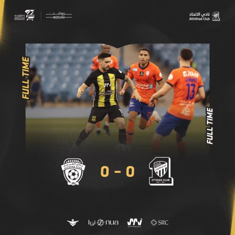 全场比赛结束,吉达联合客场0-0闷平费哈。