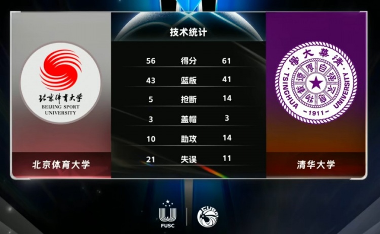 末节开局清华大学在先丢2分的情况下依靠一波7-0的攻势再次追至5分重燃希望。谢智杰的关键三分为北体大止血,但清华大学表现依旧强势,卢骏内线吃饼外线还能命中干拔三分,节中连拿9分直接帮助清华大学反超比分。北体大则连连失误拱手让出主动权,前7分钟里仅得5分兵败如山倒,鲁骜读秒阶段连拿4分追至3分但为时已晚,石奎随后战术犯规中两罚全中守住胜利。最终,清华大学61-56逆转北京体育大学杀入总决赛。