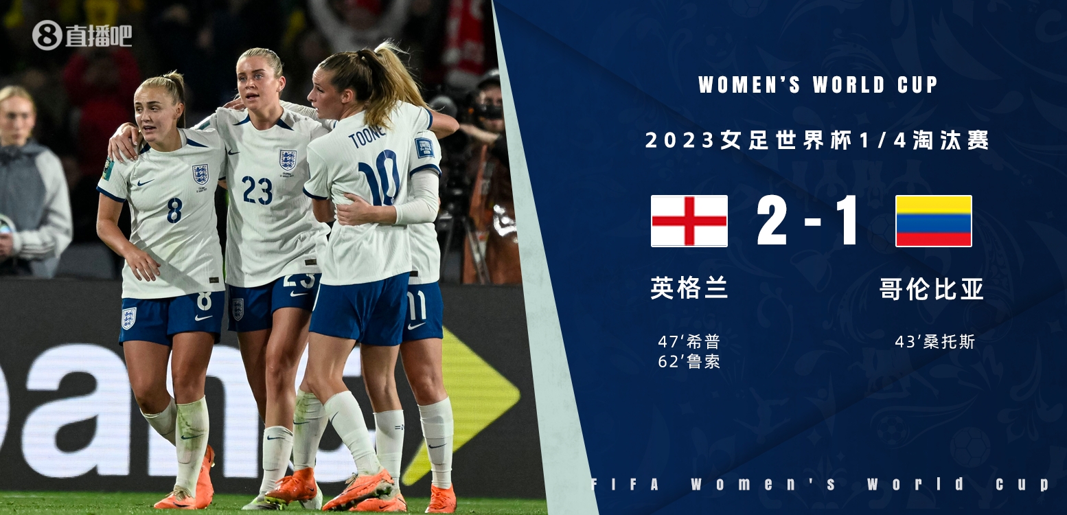 北京时间8月12日18:00,女足世界杯八强战英格兰迎战哥伦比亚的比赛,上半场桑托斯神仙球助哥伦比亚取得领先,半场结束前希普为英格兰扳平比分,下半场,斯坦威助攻鲁索反超比分,最终英格兰2-1哥伦比亚进入4强,半决赛将战东道主澳大利亚。