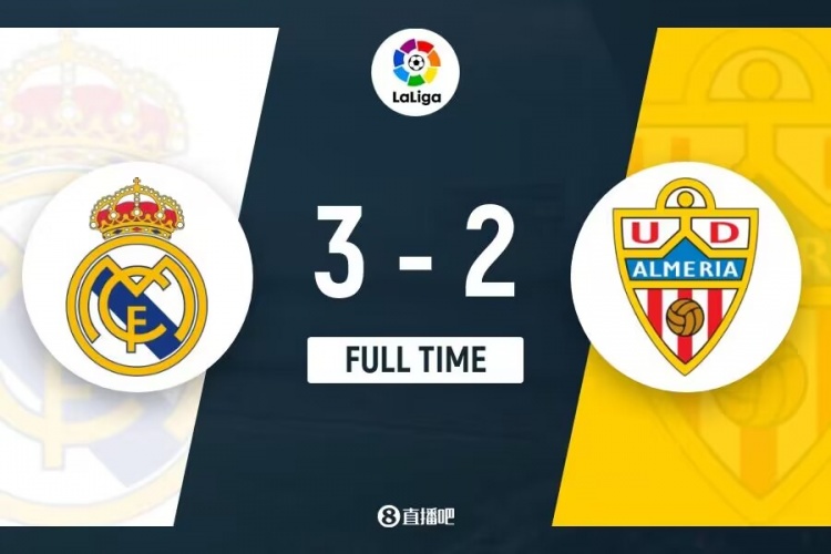 全场比赛结束,最终皇马3-2阿尔梅里亚。