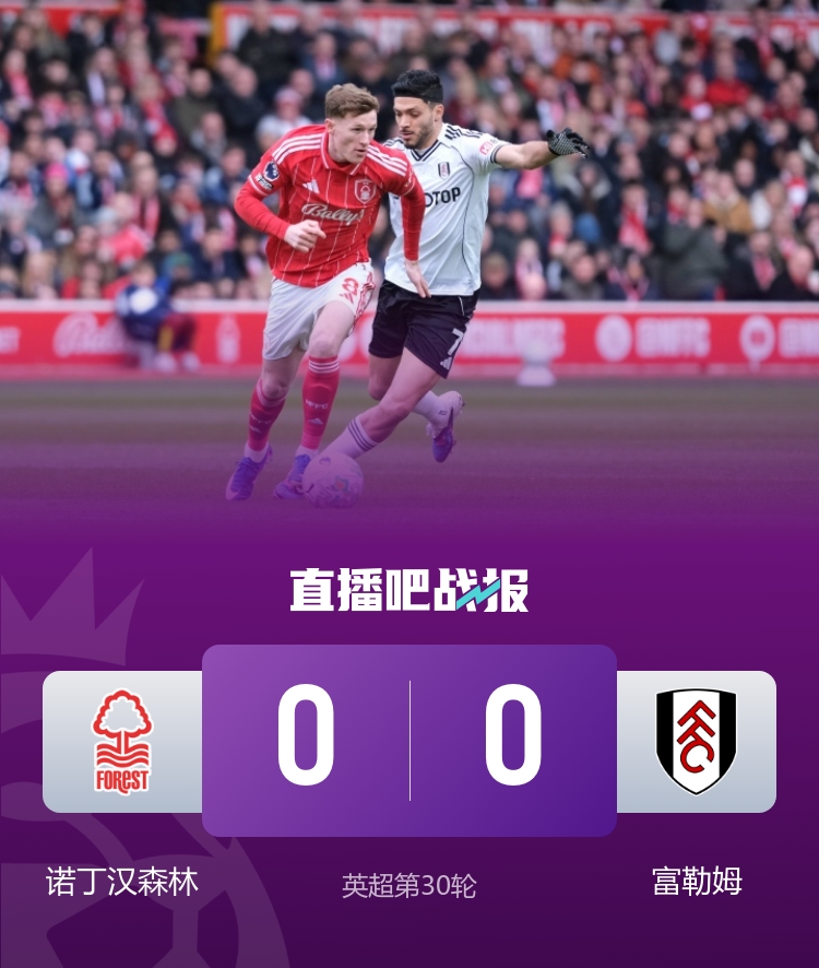 全场比赛结束,诺丁汉森林0-0富勒姆。