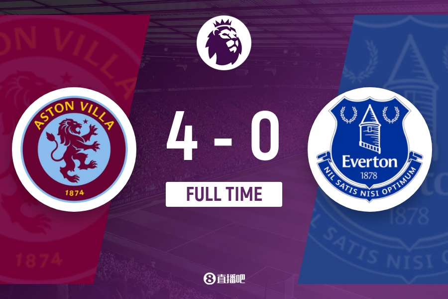 全场比赛结束,维拉4-0击败埃弗顿。