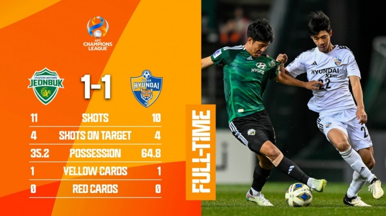 亚冠-全北主场1-1蔚山 全北3分钟闪击+后卫送礼李明载扳平