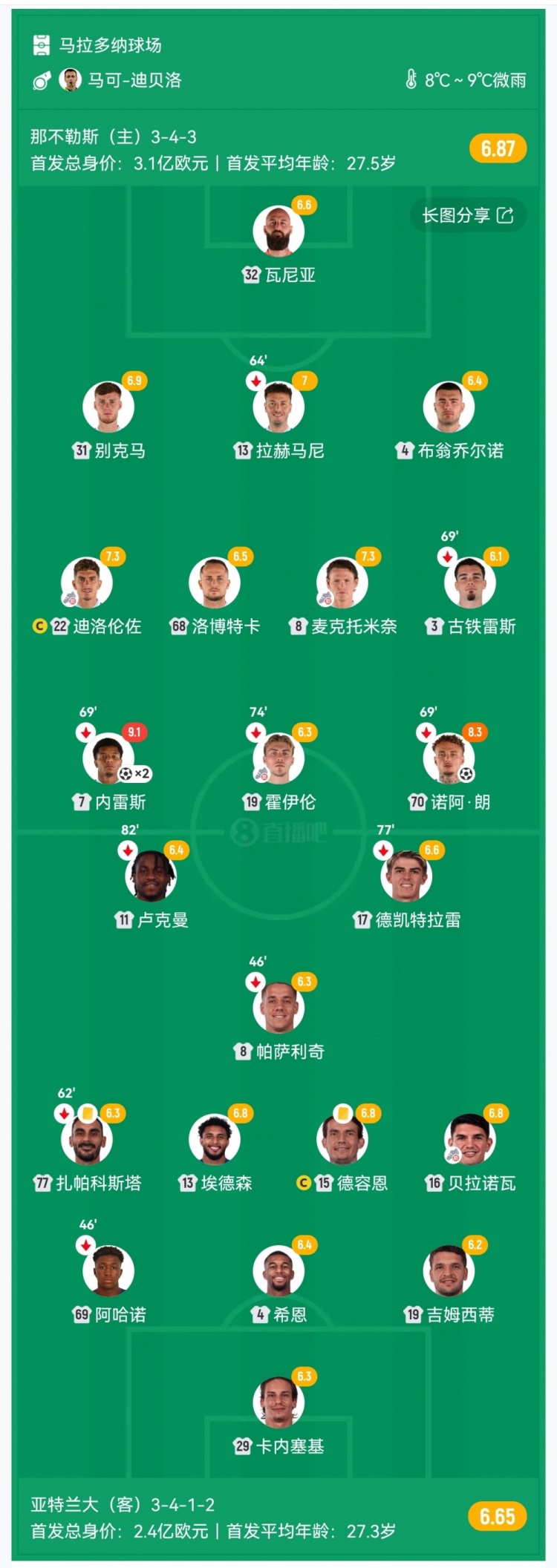 第52分钟,亚特兰大中路转移右路的进攻,贝拉诺瓦下底传中,门前斯卡马卡侧身凌空抽射入网,那不勒斯3-1亚特兰大↓