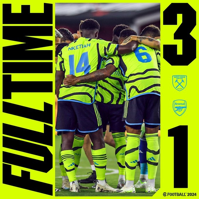 全场比赛结束,阿森纳1-3西汉姆联。