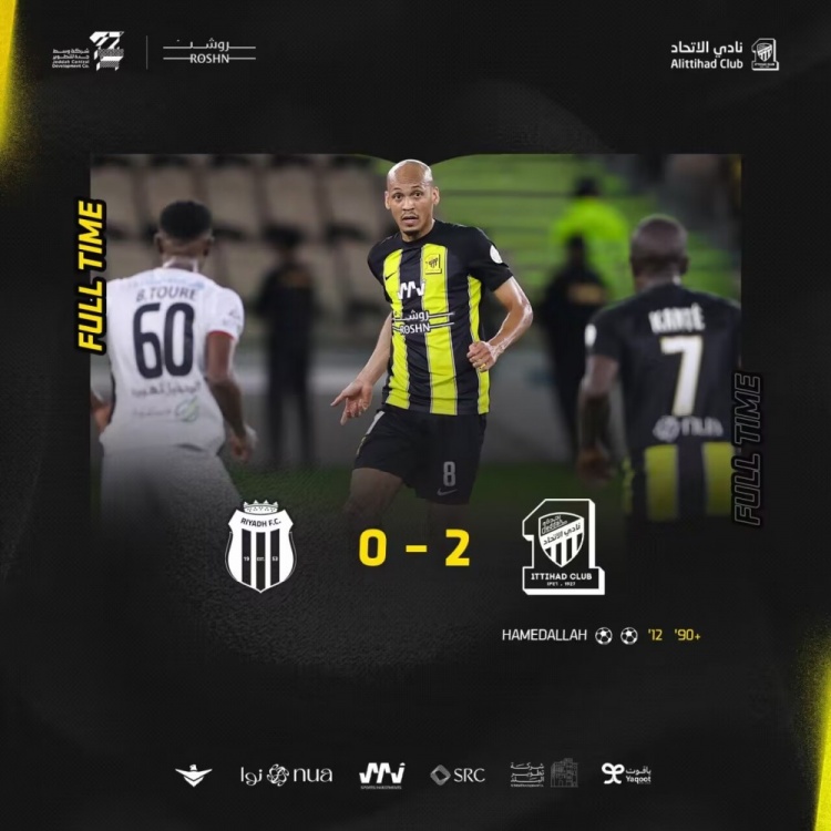 全场比赛结束,吉达联合2-0利雅得体育。