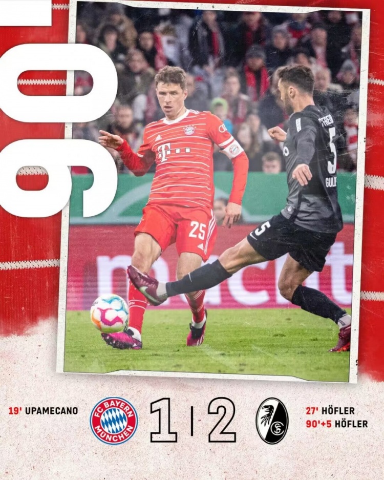 4月5日讯 北京时间4月5日凌晨2点45分,2022-23赛季德国杯1/4决赛在安联竞技场展开角逐,拜仁慕尼黑坐镇主场迎战弗赖堡。上半场于帕梅卡诺先拔头筹,霍夫勒世界波扳平,下半场格雷茨卡中框,穆西亚拉92分钟手球送点,霍勒点射绝杀。最终拜仁慕尼黑主场1-2遭弗赖堡逆转,拜仁止步德国杯8强。