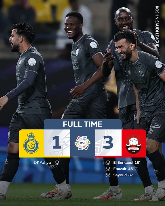 利雅得胜利首发:26-奥斯皮纳、12-纳瓦夫(63‘78-奥贾米’)、4-法蒂尔、27-拉波尔特、15-特莱斯、17-哈巴利、77-布罗佐维奇、23-叶海亚(76'46-阿利瓦)、14-纳吉(63'29-加里卜)、10-马内、7-C罗