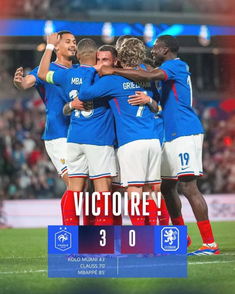 6月6日讯 足球友谊赛,法国对阵卢森堡。上半场,格列兹曼中柱,穆阿尼头槌先拔头筹。易边再战,克劳斯远射再下一城,姆巴佩两次送出助攻后完成破门。最终法国队3-0卢森堡。