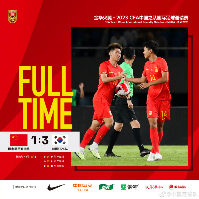 全场比赛结束,中国男足亚运队1-3不敌韩国U24队。